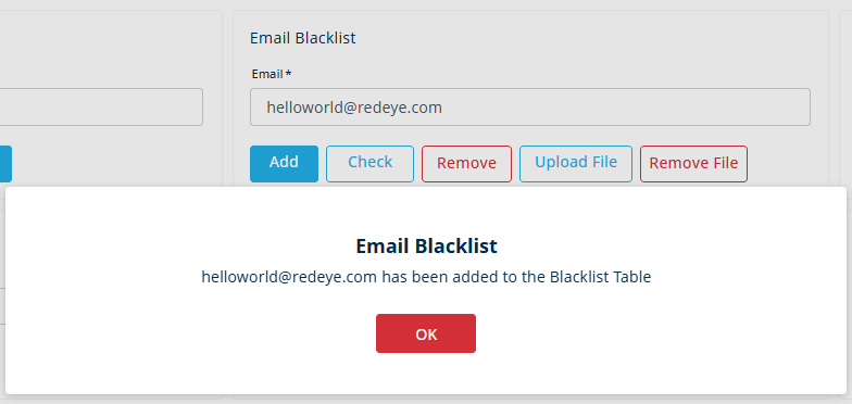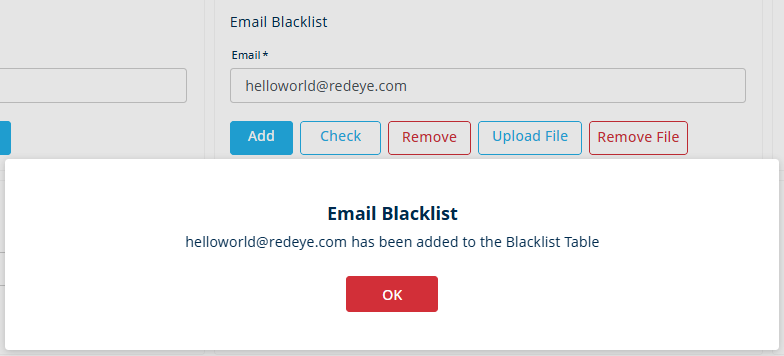 Once you acknowledge the disclaimer and submit your entry, the platform will confirm that the user has been added to the Email Blacklist. If the upload fails for any reason such as invalid headers, the platform will provide this reason.