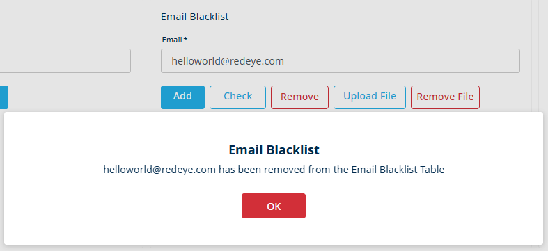 Blacklist Audit TrailAll changes to the Email Blacklist, including the user name responsible, date and time stamps are stored internally at RedEye and can be retrieved through a Support request. For any queries relating to the Email Blacklist, please speak to your Customer Success Manager.
