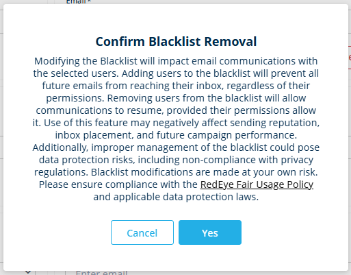 WarningIf you wish to add or remove a record from the Email Blacklist, you will need to acknowledge the confirmation statement shown below each time, explaining the risks associated with blacklist management. For instance, improper use of the Email Blacklist could result in non-compliance with privacy regulations and damage to your sender reputation. Blacklist changes are made at your own risk.