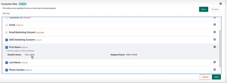 - If you would like to edit/choose what data/fields gets synced to your RedEye platform you can select settings under Customer Data and select/deselect the parameter names to suit your data needs.