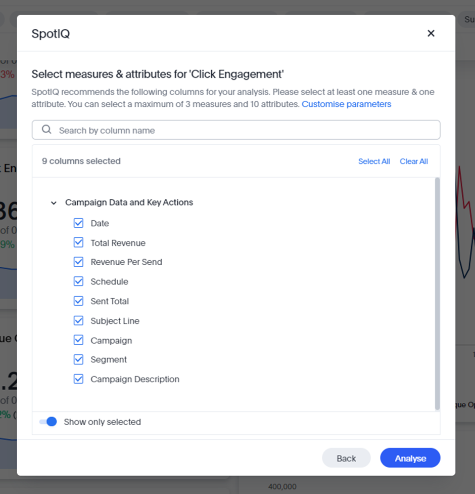 From there, you can now select the measures and attributes that you want to include in your analysis. Depending on the tile you first selected, SpotIQ will select several recommended fields to include. For instance, using a Click Engagement tile such as this one, SpotIQ will guide you towards fields such as Campaign, Schedule, Revenue Per Send and Subject Line: