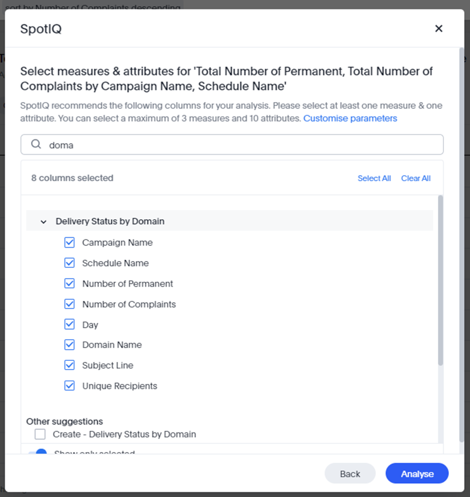 From here, select the following measures and attributes in SpotIQ to get an instant view of all Campaign and Schedule activity that has triggered any particularly high failure or complaint rates. You can easily change the timeframe or initial data points to include things like temporary failures (Number of Temporary), rejected emails (Number Rejected) or domain-level (Domain Name) analysis