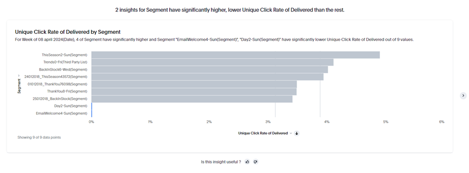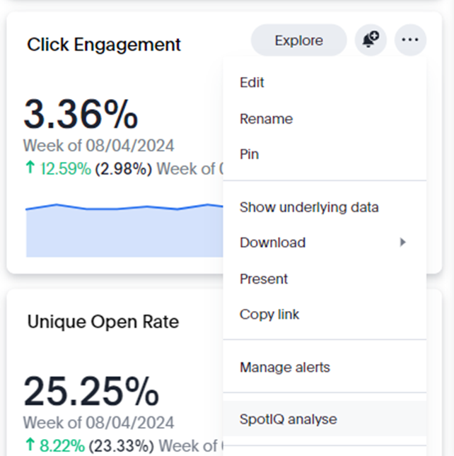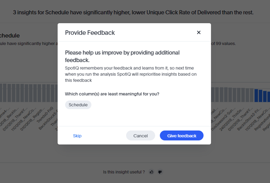 On the other hand, if a tile was generated that didn’t help you to answer any new questions, then you are encouraged to feed this back via the negative reaction (thumbs down). The most common reason for a tile adding no value is that the insight was immediately obvious. For instance, running this analysis on Click Engagement, I’m not interested in breaking down Click Rate by Schedule as this data was already available to me on my original Liveboard.