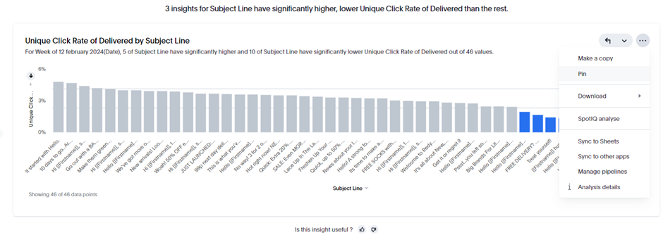 Just like any other tile, you’re able to copy, pin and download the content. You can even run a brand new SpotIQ Analyse on this new piece of content to begin the process again on a new set of data points.