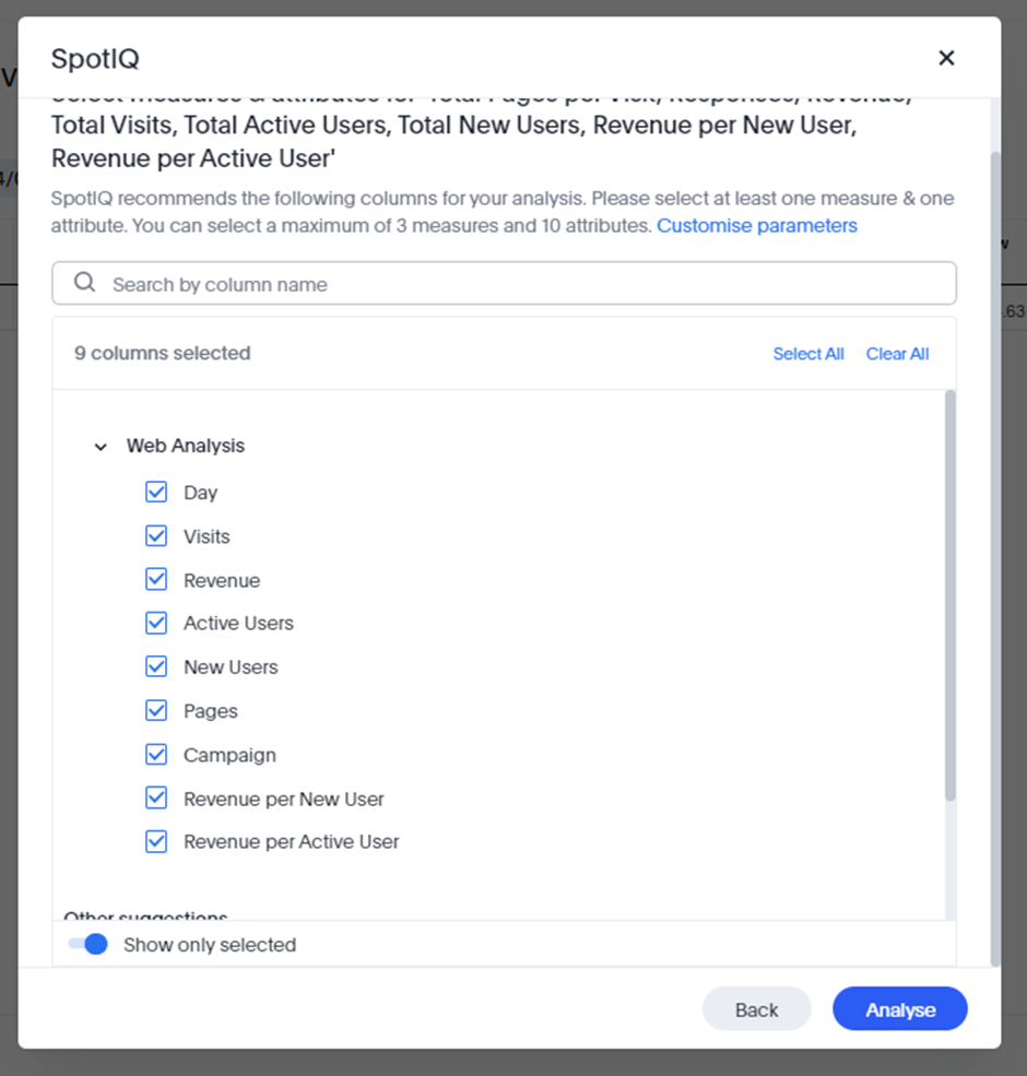 For your first analysis, we would recommend leaving the default measures selected, but here you can also toggle off “Show only selected” and choose from all the measures and attributes available in your starting Worksheet, enabling you to create your own custom analysis.